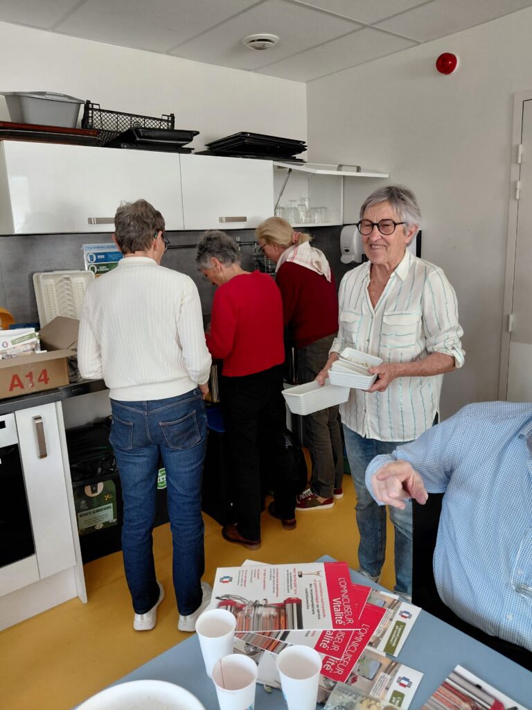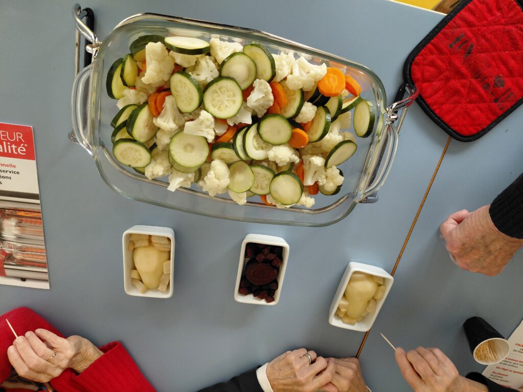 – Dégustation des plats dés la fin de cuisson. Catherine avait lancé la jardinière de légumes vapeurs dés le début de l’atelier et amené un cake aux olives de chez elle,