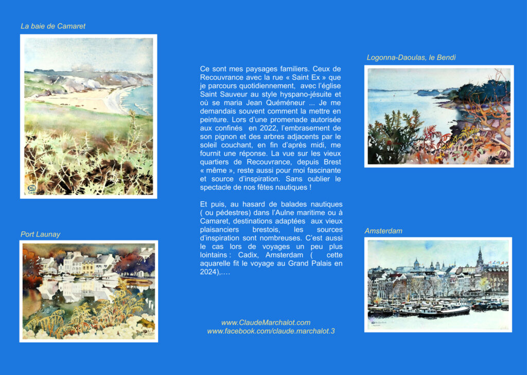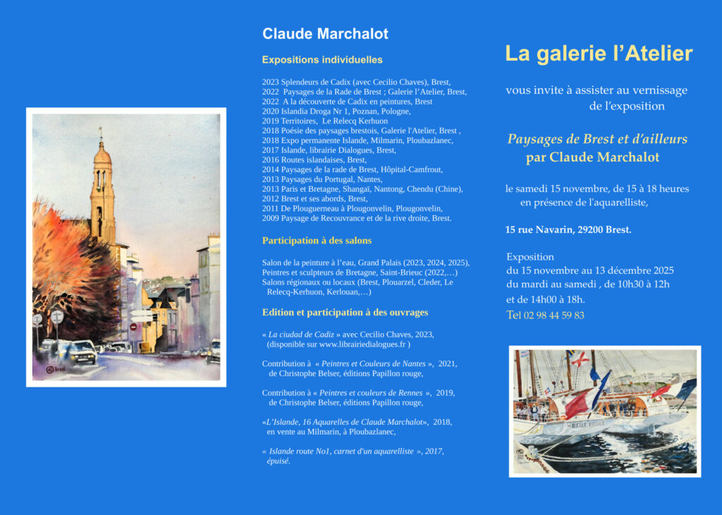 Luc Drévès nous signale la très prochaine expo de notre collègue Claude Marchalot, un sacré aquarelliste, à la galerie l’Atelier, 15 rue Navarin à Brest, du 15 novembre au 13 décembre. L’expo s’intitule « Paysages de Brest et d’ailleurs ».